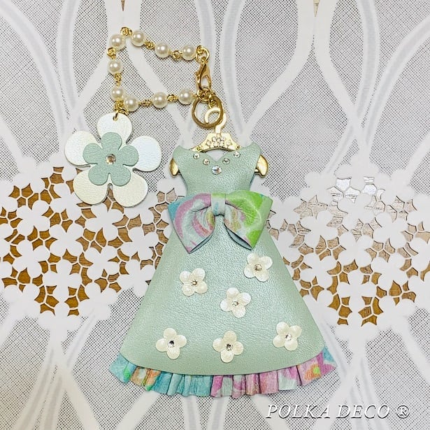 ミントグリーンの爽やかなドレスに白い小花のレザーや大き目のウエストリボン、裾にはフリルがあるとても可愛いドレスチャームです。